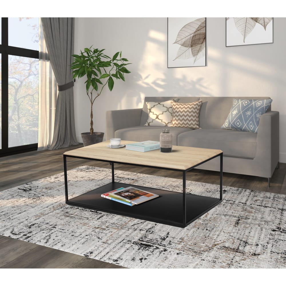 Einführung eines modernen Couchtisches mit rechteckigem Design. Die Tischplatte besteht aus Spanplatte mit Eichenoptik, die ein warmes und natürliches Aussehen verleiht. Das Gestell ist aus schwarzem Metall gefertigt und verleiht eine elegante und zeitgenössische Note. Dieser Couchtisch ist eine perfekte Mischung aus Stil und Funktionalität für jeden Wohnraum.