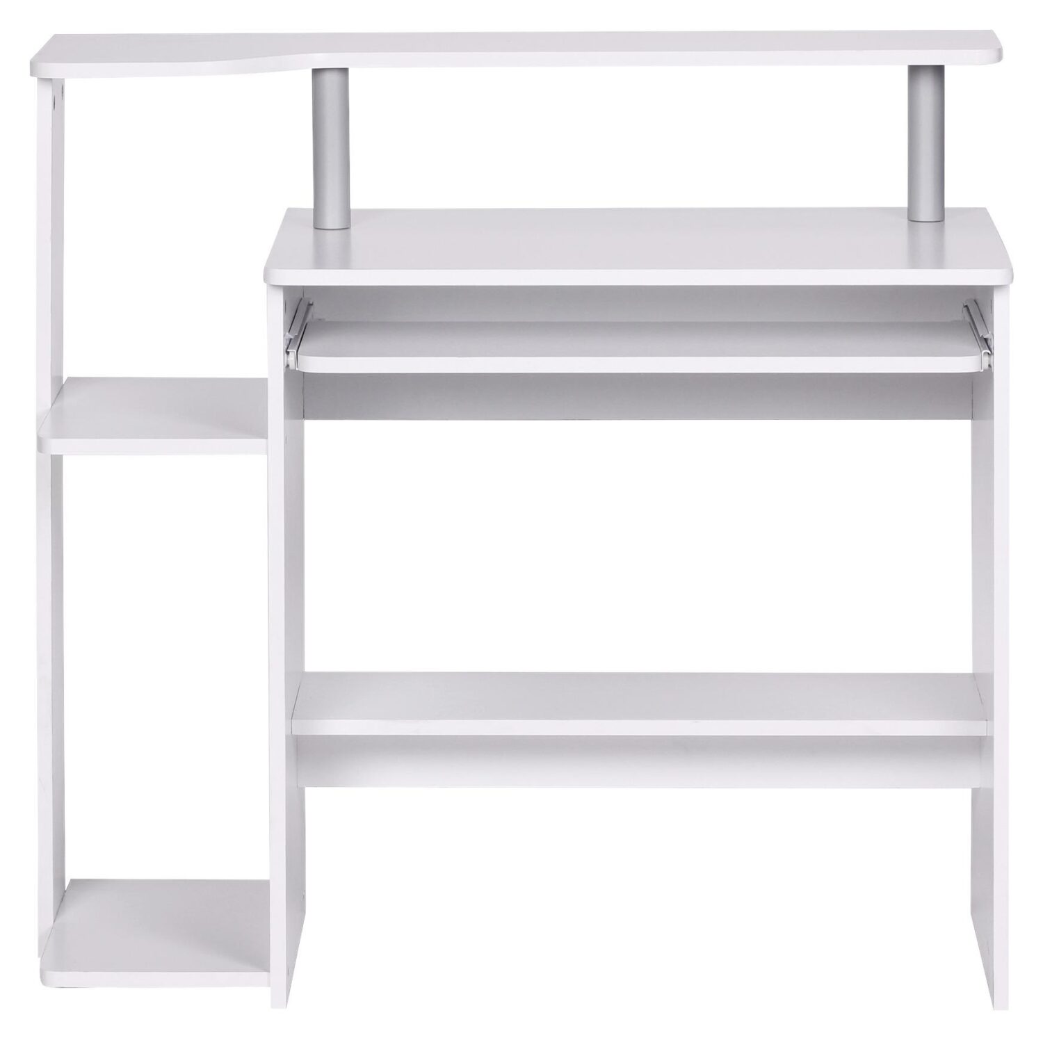 Dieser Computertisch in Weiß bietet Ihnen einen ordentlichen und übersichtlichen Arbeitsplatz. Der integrierte Monitoraufsatz und der Tastaturauszug machen den Computertisch aus MDF zur optimalen Wahl. Rechner und Drucker finden dank der großzügigen Ablageflächen ebenso Platz wie Ihre Arbeitsunterlagen. Kompakt, praktisch und gut durchdacht – dieser Schreibtisch überzeugt.