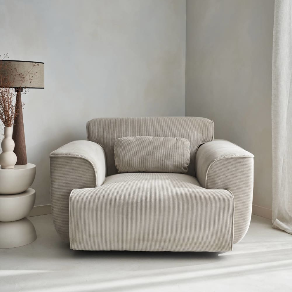 Die ProduktvorteileCordbezugMitgeliefertes KissenGroße SitzflächeEinfache MontageDieser Sessel mit Cordbezug verleiht einer klassischen Dekoration einen originellen Touch. Sein schickes und elegantes Aussehen bleibt einfach, aber einzigartig. Mit seiner tiefen Sitzfläche eignet er sich perfekt zum Entspannen am Wochenende oder nach einem langen Arbeitstag. Er wird mit einem kleinen, rechteckigen Kissen mit abziehbaren Bezug geliefert, und Sie können ein Plaid für noch mehr Stil hinzufügen. Gönnen Sie sich mit dem schönen Stoff und den vornehmen Linien ein minimalistisches und kuscheliges Wohnzimmer!Achtung: für den Transport können einige Elemente des Sofas unter den Sitzflächen verstaut werden.Tipps zur PflegeNicht waschen. Nicht Bleichen. Nicht im Wäschetrockner trocknen. Nicht bügeln. Keine chemische Reinigung.EigenschaftenDichte: 335 g/m².Form: GeradeMaterial: CordMontage: Die Füße sind für den Transport nicht angebracht. Sie müssen nur noch mithilfe des mitgelieferten Werkzeugs montiert werden, damit Sie so schnell wie möglich von Ihrem Sessel profitieren können!Anzahl der Sitzplätze: 1Kissen: 100% PolyesterBezug: Cord (Flächengewicht: 335g / m²)AbmessungenSessel: B 116 x T 97 x H 73 cmSitzfläche: B 57 x T 67 cmHöhe der Sitzfläche: 40,5 cmRückenlehne: B 88 x H 40 cmBreite der Armlehne: 29 cmHöhe der Armlehne: 59 cmMaße Kissen: B 48 x H 25 cmMax. Belastung: 110 kg