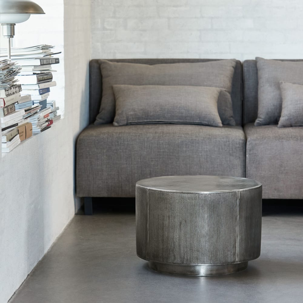 Entdecken Sie die Raffinesse des Couchtisches Rota, der sorgfältig aus gebürstetem silberfarbenem Aluminium gefertigt wurde. Mit seinen großzügigen Abmessungen von 50 cm Länge und Breite bei einer Höhe von 35 cm bringt dieses zentrale Möbelstück Stil und Funktionalität in Ihren Wohnbereich. Das markante Design des Tisches, das mit vertikalen Rillen verziert ist, bietet ein modernes und zugleich elegantes Aussehen und fügt eine visuell fesselnde Textur hinzu. Der Couchtisch Rota von House Doctor wurde so entworfen, dass er sich harmonisch in jede Art von Inneneinrichtung einfügt. Der Rota-Tisch ist nicht nur praktisch und attraktiv, sondern auch pflegeleicht. .
