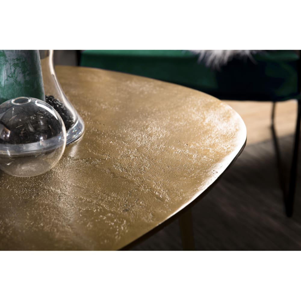 Couchtisch in Tropfenform Aluminium vergoldet Größe: ?85 x 56 x 48 cm. Artikel aus Aluminium und Metall. Diese Kollektion ist einfach einzigartig, da sie durch ihr edles Material besonders auffällt. Im Handumdrehen wird diese orientalisch anmutende Reihe mit ihrer goldenen und silbernen Farbe Ihr Zuhause erhellen. Einfach und trendy, dieser entzückende Couchtisch in Tropfenform wird Ihr Wohnzimmer zum Leuchten bringen. Mit nur drei Beinen ausgestattet, ist er originell. Sein goldener Farbton passt perfekt zu Ihrer Dekoration!