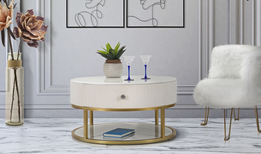 Runder Kaffeetisch aus gepolstertem Samt in Beige, mit Platte und Tablar aus marmorähnlichem Holz und Gestell aus vergoldetem Metall. Komplett mit Schublade. Masse Ø cm 75×36. Zum Reinigen mit einem feuchten Tuch oder Dampf.
