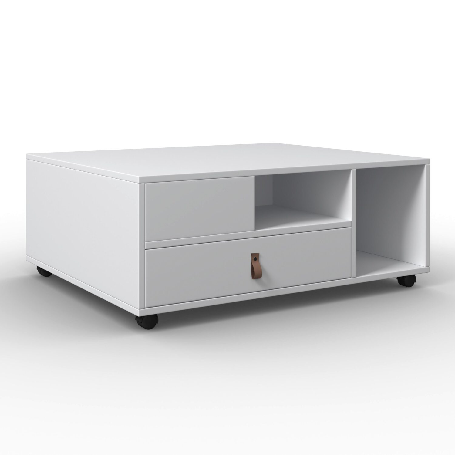 Dieser Couchtisch in Weiß ist eine praktische und schicke Ergänzung für Ihr Zuhause. Die 5 Rollen machen den Couchtisch zum flexiblen Möbelstück. Der rechteckige Couchtisch aus MDF ist melaminharzbeschichtet und verfügt über 2 Schubladen sowie 2 offene Fächer. Ein Schlaufengriff in Beige unterstreicht das harmonische Erscheinungsbild. HINWEIS Bitte beachten Sie, dass die abgebildete Dekoration im Lieferumfang nicht enthalten ist.