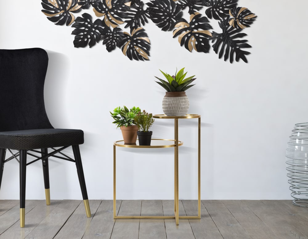 Couchtisch aus vergoldetem Metall mit einfachen und geometrischen Linien mit 2 Platten aus geräuchertem Glas. Abmessungen cm 50x40x60,5. Verwenden Sie zum Reinigen ein feuchtes Tuch oder Dampf.