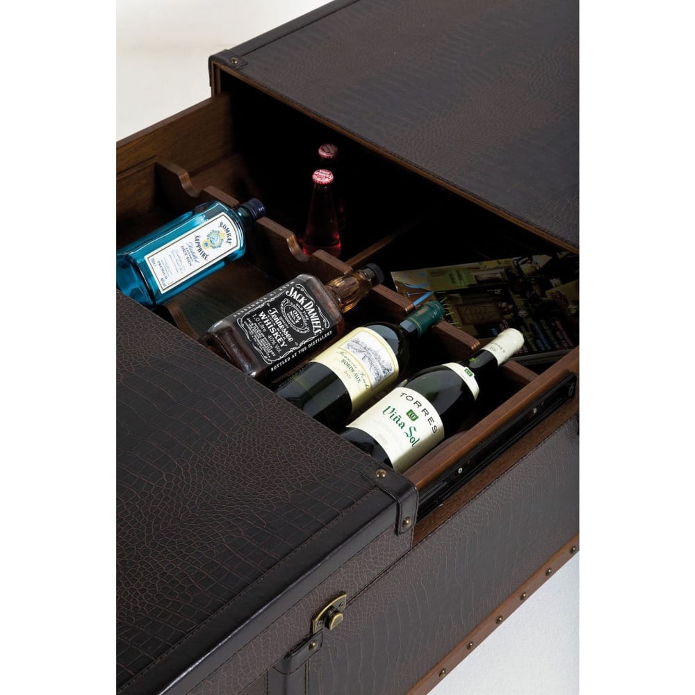Dieser edel verarbeitete Couchtisch auf Rollen in Braun ist ein Muss für jeden gastfreundlichen Haushalt, den er bietet nicht nur eine schicke Abstellfläche, sondern eine Bar in seinem Inneren. Die Tischplatte lässt sich problemlos aufschieben und bietet Zugang zu verschiedenen Fächern, in denen Sie all Ihre Bar-Utensilien aufbewahren können, einschließlich Flaschenhalter, Fächern und einem herausnehmbaren Tablett. Der Tisch ist mit einem beschichteten Textilbezug in Reptilienprägung versehen und bietet Platz für bis zu 12 Flaschen (liegend). Der stabile Rahmen und Korpus bestehen aus Holz, während die Metall-Beschläge verkupfert sind, was dem Möbelstück einen eleganten Akzent verleiht. Mit seinem stilvollen Design und seinen praktischen Funktionen ist dieser Couchtisch ein perfektes Barmöbel für Ihre Wohnzimmereinrichtung.