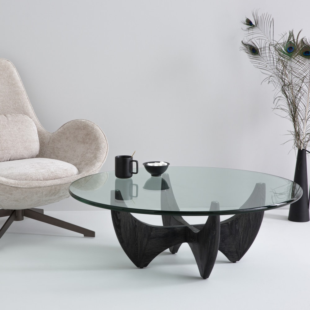 Couchtisch rund Eiche schwarz massiv mit Glasplatte – L100 cm von Signature