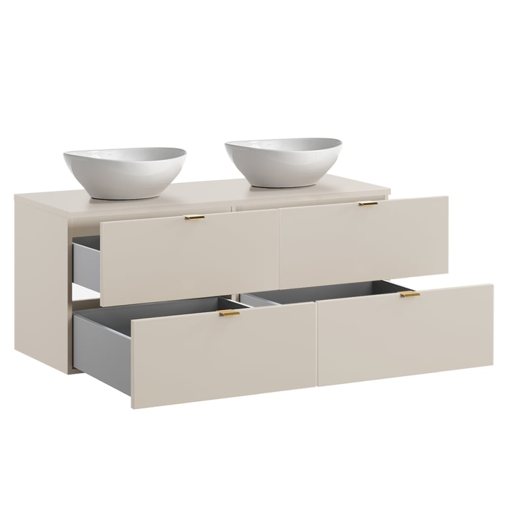 Doppelwaschtisch 120cm Azel KaschmirKollektion :: Azel Europäische Herstellung Materialien : Front aus 16 mm MDF-PlattenKorpus aus 16 mm MelaminplattenWaschtisch aus 25 mm MDF-Platten70% FSC-zertifiziertes Holz aus nachhaltiger ForstwirtschaftWaschbecken aus Keramik Farbe : Kaschmir3 Grifffarben: Glänzendes Gold, Glänzendes Chrom und Mattschwarz inklusiveWeiße Waschbecken Eigenschaften: Hängeschrank2 SchubladenInklusive WaschtischInklusive AufsatzwaschbeckenGeräuscharmes SchließsystemWandbefestigungen: Inklusive Schrauben und DübelEs wird jedoch empfohlen, Ihre Befestigungen an Ihren Untergrund anzupassenDieses Möbelstück gibt es in 3 Größen: 60 cm, 80 cm und 120 cm. Weitere Informationen : Spiegel nicht inbegriffenArmaturen nicht inbegriffenFreier Auslauf nicht inbegriffenPlatzsparender Siphon nicht inbegriffenWaschtisch nicht gebohrt Gewicht : Waschtischunterschrank: 40 kgWaschbecken: 7 kg Abmessungen : Waschtischunterschrank: 120 x 46 x 52,2 cmWaschbecken: 40,5 x 33 x 14 cm Die angegebenen Maße können um einige Millimeter abweichen Montagehinweise : Dieses Möbelstück ist für eine Wasserzufuhr aus der Wand konzipiert. Für eine optimale Montage wird die Verwendung eines Platzspar-Siphons dringend empfohlen, je nach Modell ist dieser sogar obligatorisch, um das ordnungsgemäße Schließen der Schubladen zu gewährleisten und Kollisionen mit der Rohrleitung zu vermeiden. Verpackung : Produkt wird zur Montage geliefert, inkl. Anleitung Produkt mit 24-Monats-Garantie Gesamtanzahl der Kartons : 5 16,5 kg56,3 x 10,4 x 80,1 cm / 16,5 kg56,3 x 10,4 x 80,1 cm / 10 kg53,7 x 3,5 x 133,3 cm / 7,5 kg40 x 22 x 46 cm / 7,5 kg40 x 22 x 46 cm