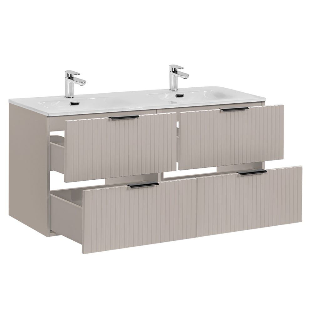 Doppelwaschtisch-Unterschrank 120cm Adriel KaschmirKollektion :: Adriel Herstellung: Europäische Herstellung Materialien : Melamin- und MDF-Platten 16 mm70% FSC-zertifiziertes Holz aus nachhaltiger ForstwirtschaftKeramikwaschbeckenPVC-Griffe Farbe : Kaschmir-Möbel3 Grifffarben: Mattschwarz, Gold und Silber inklusive Die Farbe auf dem Foto kann je nach den Einstellungen Ihres Bildschirms (Kontrast, Helligkeit) variieren. Eigenschaften : Waschtisch : Hängeschrank4 SchubladenGeräuscharmes Schließsystem1 Doppelwaschbecken zum Einbauen inbegriffenWandbefestigungen : Schrauben und Dübel nicht inbegriffenEs wird empfohlen, Ihre Befestigungen an Ihren Untergrund anzupassenDieses Möbelstück gibt es in 3 Größen : 60 cm, 80 cm und 120 cmDieses Möbelstück gibt es in 3 Farben : Mattschwarz, Weiß und Holz in Eichenoptik. Weitere Informationen : Spiegel Nicht inbegriffenArmaturen Nicht inbegriffenFreier Auslauf Nicht inbegriffenPlatzsparender Siphon Nicht inbegriffen Gewicht : Waschtischunterschrank: 44 kgWaschbecken: 26 kg Abmessungen : Waschtischunterschrank: 120,4 x 46 x 57 cmWaschbecken: 121 x 46 x 17 cm Die angegebenen Maße können um einige Millimeter abweichen. Sicherheitsstandards: EN 14688 garantiert die Sicherheit und Nassleistung von Waschbecken Verpackung : Produkt wird zur Montage geliefert, inklusive Anleitung. Produktgarantie: 24 Monate Gesamtanzahl der Kartons : 3 Gewicht und Abmessungen der Kartons: 22 kg / 82 x 48 x 13 cm22 kg / 82 x 48 x 13 cm26 kg / 124 x 48 x 19 cm Gesetzlicher Vertreter: NAPKINS, 30/34 avenue Henri Matisse, 06200 Nizza, FRANKREICH