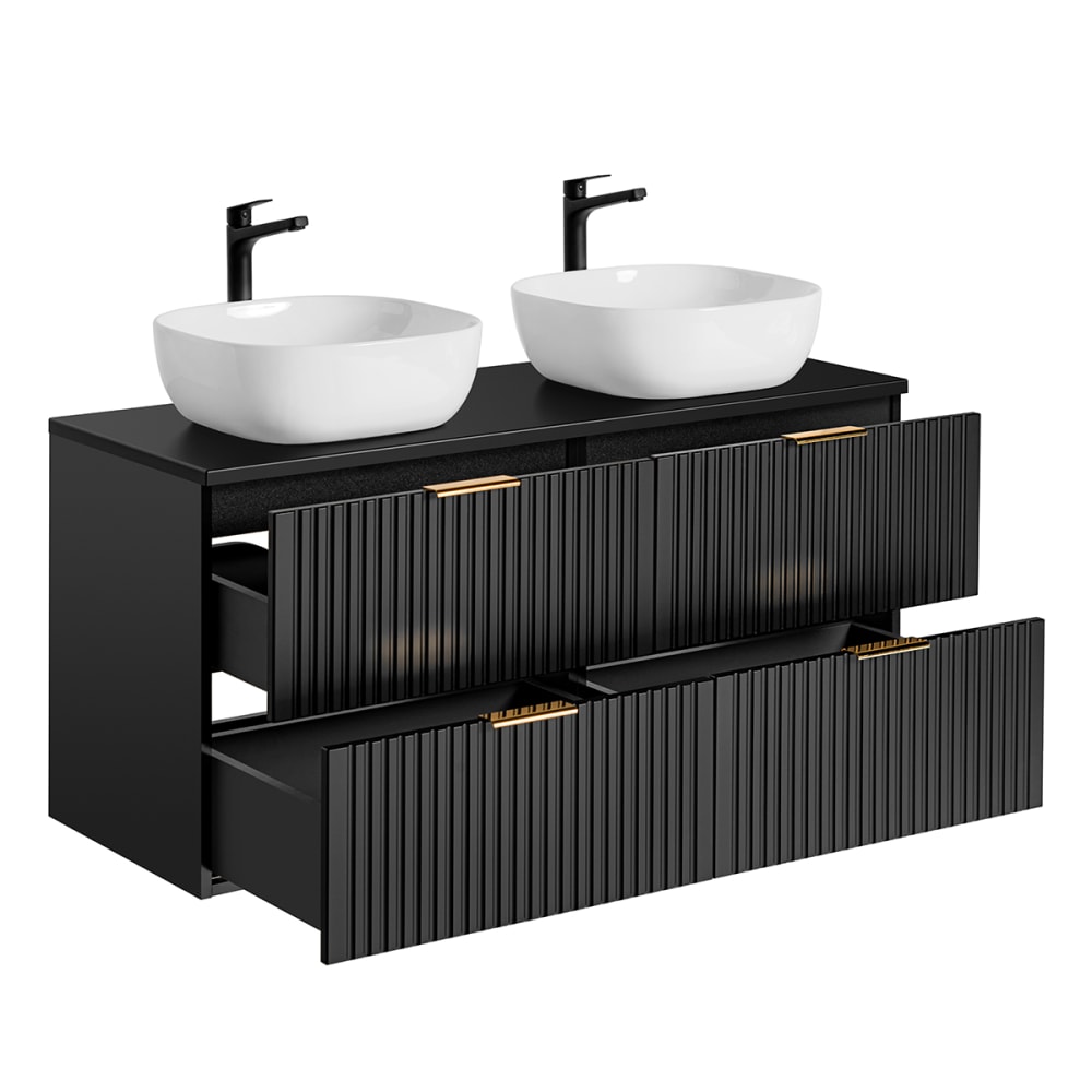 Doppelwaschtisch 120cm Adriel SchwarzKollektion :: Adriel Materialien : Melamin- und MDF-Platten 16 mm70% FSC-zertifiziertes Holz aus nachhaltiger ForstwirtschaftKeramikwaschbeckenPVC-Griffe Farbe : Mattschwarz3 Grifffarben: Mattschwarz, Gold und Silber inbegriffen Eigenschaften: Hängeschrank4 SchubladenGeräuscharmes Schließsystem2 Aufsatzwaschbecken inklusiveInklusive WaschtischWandbefestigung: Schrauben und Dübel nicht inklusiveEs wird empfohlen, die Befestigung an den Untergrund anzupassenErhältlich in 3 Größen: 60 cm, 80 cm und 120 cmErhältlich in 3 Farben: Mattschwarz, Weiß und Holz in Eichenoptik Weitere Informationen : Armaturen Nicht inbegriffenFreier Auslauf Nicht inbegriffenPlatzsparender Siphon Nicht inbegriffenWaschtischplatte nicht gebohrt Gewicht : Waschtischunterschrank: 53 kgWaschbecken: 7 kg Abmessungen : Waschtischunterschrank: 120,8 x 46 x 59 cmWaschbecken: 41 x 41 x 15 cm Die angegebenen Maße können um einige Millimeter abweichen. Montagehinweise : Dieses Möbelstück ist für eine Wasserzufuhr aus der Wand konzipiert. Für eine optimale Montage wird die Verwendung eines Platzspar-Siphons dringend empfohlen, je nach Modell ist dieser sogar obligatorisch, um das ordnungsgemäße Schließen der Schubladen zu gewährleisten und Kollisionen mit der Rohrleitung zu vermeiden. Verpackung : Produkt wird geliefert, muss zusammengebaut werden, inkl. Anleitung. Produkt mit 24-monatiger Garantie. Gesamtanzahl der Kartons : 5 Gewicht und Größe der Kartons: 22 kg82 x 48 x 13 cm / 22 kg82 x 48 x 13 cm / 9 kg133 x 51 x 4 cm / 8 kg52 x 52 x 24 cm / 8 kg52 x 52 x 24 cm