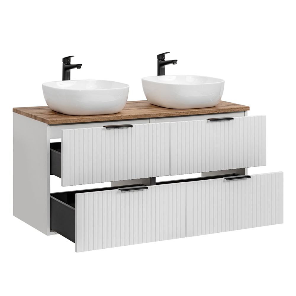 Doppelwaschtisch 120cm Adriel WeißKollektion :: Adriel Materialien : Melamin- und MDF-Platten 16 mm70% FSC-zertifiziertes Holz aus nachhaltiger ForstwirtschaftKeramikwaschbeckenPVC-Griffe Farbe : Möbel in WeißWaschtisch aus Holz in Eichenoptik3 Grifffarben: Mattschwarz, Gold und Silber inklusive Eigenschaften: Hängeschrank4 SchubladenGeräuscharmes Schließsystem2 Aufsatzwaschbecken inklusiveInklusive WaschtischWandbefestigung: Schrauben und Dübel nicht inklusiveEs wird empfohlen, die Befestigung an den Untergrund anzupassenErhältlich in 3 Größen: 60 cm, 80 cm und 120 cmErhältlich in 3 Farben: Mattschwarz, Weiß und Holz in Eichenoptik Weitere Informationen : Armaturen Nicht inbegriffenFreier Auslauf Nicht inbegriffenPlatzsparender Siphon Nicht inbegriffenWaschtischplatte nicht gebohrt Gewicht : Waschtischunterschrank: 53 kgWaschbecken: 7 kg Abmessungen : Waschtischunterschrank: 120,8 x 46 x 59 cmWaschbecken: 41 x 41 x 15 cm Die angegebenen Maße können um einige Millimeter abweichen. Montagehinweise : Dieses Möbelstück ist für eine Wasserzufuhr aus der Wand konzipiert. Für eine optimale Montage wird die Verwendung eines Platzspar-Siphons dringend empfohlen, je nach Modell ist dieser sogar obligatorisch, um das ordnungsgemäße Schließen der Schubladen zu gewährleisten und Kollisionen mit der Rohrleitung zu vermeiden. Verpackung : Produkt wird geliefert, muss zusammengebaut werden, inkl. Anleitung. Produkt mit 24-monatiger Garantie. Gesamtanzahl der Kartons : 5 Gewicht und Größe der Kartons: 22 kg82 x 48 x 13 cm / 22 kg82 x 48 x 13 cm / 9 kg133 x 51 x 4 cm / 8 kg52 x 52 x 24 cm / 8 kg52 x 52 x 24 cm
