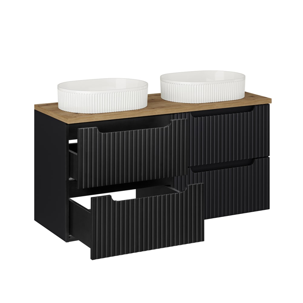 Doppelwaschtisch 120cm 4 Schubladen Riva Schwarz und HolzKollektion :: Riva Herstellung: Europäisch Materialien : Front aus 16 mm MDF-PlattenKorpus aus 16 mm MelaminplattenWaschtisch aus 25 mm MDF-Platten70% FSC-zertifiziertes Holz aus nachhaltiger ForstwirtschaftWaschbecken aus Keramik Farbe : SchwarzWaschtisch aus Holz in Eichenoptik und weißes Waschbecken Eigenschaften: Hängeschrank4 SchubladenGeräuscharmes Schließsystem2 Aufsatzwaschbecken InklusiveWaschtisch InklusiveWandbefestigungen: Schrauben und Dübel nicht inklusiveEs wird empfohlen, die Befestigungen an den Untergrund anzupassenDieses Möbelstück ist in 5 Größen erhältlich: 50 cm, 60 cm, 80 cm, 120 und 140 cmDieses Möbelstück ist in 3 Farben erhältlich: Schwarz, Weiß und Kaschmir. Weitere Informationen : Spiegel Nicht im Lieferumfang enthaltenArmaturen Nicht im Lieferumfang enthaltenFreier Auslauf Nicht im Lieferumfang enthaltenPlatzsparender Siphon Nicht im Lieferumfang enthaltenWaschtischplatte nicht gebohrt Gewicht : Waschtischunterschrank: 48 kgWaschbecken: 7 kg Abmessungen : Waschtischunterschrank: 120,4 x 40 x 59,5 cmWaschbecken: 48 x 32,5 x 11 cm Die angegebenen Maße können um einige Millimeter abweichen. Montagehinweise : Dieses Möbelstück ist für eine Wasserzufuhr aus der Wand konzipiert. Für eine optimale Montage wird die Verwendung eines Platzspar-Siphons dringend empfohlen, je nach Modell ist dieser sogar obligatorisch, um das ordnungsgemäße Schließen der Schubladen zu gewährleisten und Kollisionen mit der Rohrleitung zu vermeiden. Verpackung : Produkt wird zur Montage geliefert, inklusive Anleitung. Garantie: Produktgarantie von 24 Monaten. Gesamtanzahl der Kartons : 5 Gewicht und Abmessungen der Kartons: 20 kg85,2 x 40,8 x 13,8 cm / 20 kg85,2 x 40,8 x 13,8 cm / 13 kg141 x 43,4 x 3,5 cm / 8 kg57 x 42 x 20 cm / 8 kg57 x 42 x 20 cm