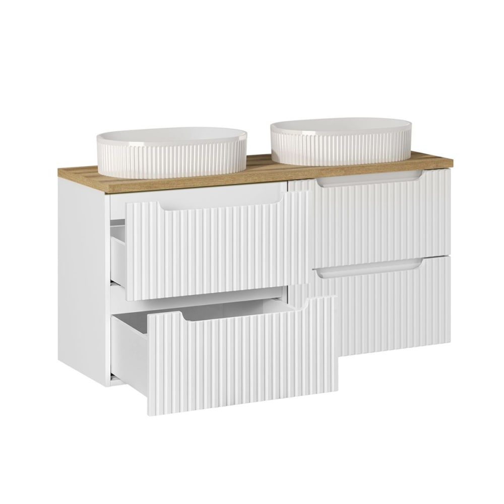 Doppelwaschtisch 120cm 4 Schubladen Riva Weiß und HolzKollektion :: Riva Herstellung: Europäisch Materialien : Front aus 16 mm MDF-PlattenKorpus aus 16 mm MelaminplattenWaschtisch aus 25 mm MDF-Platten70% FSC-zertifiziertes Holz aus nachhaltiger ForstwirtschaftWaschbecken aus Keramik Farbe : WeißWaschtisch aus Holz in Eichenoptik und weißes Waschbecken Eigenschaften: Hängeschrank4 SchubladenGeräuscharmes Schließsystem2 Aufsatzwaschbecken InklusiveWaschtisch InklusiveWandbefestigungen: Schrauben und Dübel nicht inklusiveEs wird empfohlen, die Befestigungen an den Untergrund anzupassenDieses Möbelstück ist in 5 Größen erhältlich: 50 cm, 60 cm, 80 cm, 120 und 140 cmDieses Möbelstück ist in 3 Farben erhältlich: Schwarz, Weiß und Kaschmir. Weitere Informationen : Spiegel Nicht im Lieferumfang enthaltenArmaturen Nicht im Lieferumfang enthaltenFreier Auslauf Nicht im Lieferumfang enthaltenPlatzsparender Siphon Nicht im Lieferumfang enthaltenWaschtischplatte nicht gebohrt Gewicht : Waschtischunterschrank: 48 kgWaschbecken: 7 kg Abmessungen : Waschtischunterschrank: 120,4 x 40 x 59,5 cmWaschbecken: 48 x 32,5 x 11 cm Die angegebenen Maße können um einige Millimeter abweichen. Montagehinweise : Dieses Möbelstück ist für eine Wasserzufuhr aus der Wand konzipiert. Für eine optimale Montage wird die Verwendung eines Platzspar-Siphons dringend empfohlen, je nach Modell ist dieser sogar obligatorisch, um das ordnungsgemäße Schließen der Schubladen zu gewährleisten und Kollisionen mit der Rohrleitung zu vermeiden. Verpackung : Produkt wird zur Montage geliefert, inklusive Anleitung. Garantie: Produktgarantie von 24 Monaten. Gesamtanzahl der Kartons : 5 Gewicht und Abmessungen der Kartons: 20 kg85,2 x 40,8 x 13,8 cm / 20 kg85,2 x 40,8 x 13,8 cm / 13 kg141 x 43,4 x 3,5 cm / 8 kg57 x 42 x 20 cm / 8 kg57 x 42 x 20 cm
