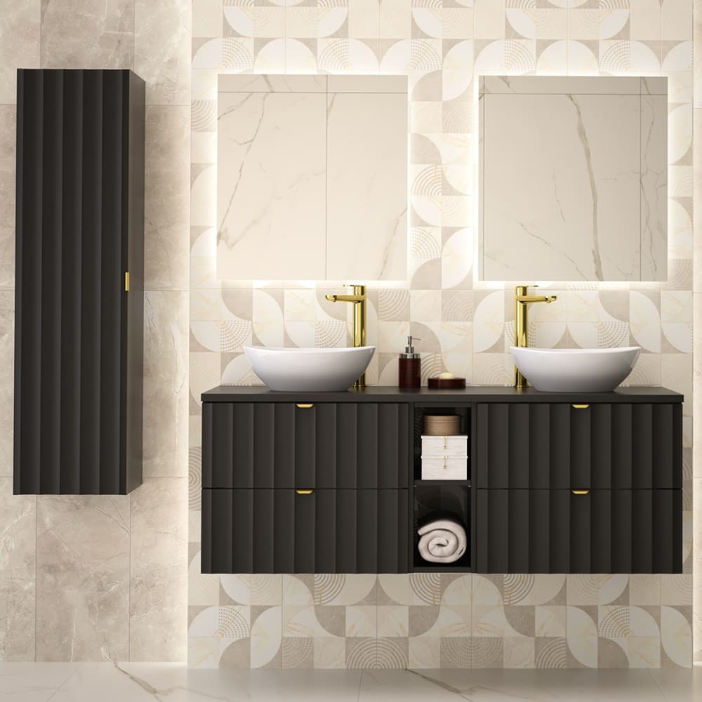 Doppelwaschtisch 140cm 2 Nischen und Säule Lexa SchwarzKollektion :: Lexa Europäische Herstellung Materialien : Front aus 18 mm MDF-PlattenKorpus aus 16 mm LaminatplattenWaschtisch aus 22 mm MDF-Platten und PVC-FinishsFSC-zertifiziertes Holz aus nachhaltiger ForstwirtschaftKeramikwaschbeckenMetallgriffe Farbe : Schwarz und goldene Griffe Eigenschaften : Waschtisch : Hängeschrank4 Schubladen2 NischenGeräuscharmes SchließsystemAufsatzwaschbecken inbegriffenAbflussdurchmesser : 45 mmWaschtisch inbegriffenWandbefestigungen : Schrauben und Dübel inbegriffenEs wird jedoch empfohlen, Ihre Befestigungen an Ihren Untergrund anzupassen. Eigenschaften : Säule : Hängemöbel1 umkehrbare Schiebetür (links oder rechts zu öffnen)4 Regalböden Geräuscharmes SchließsystemWandbefestigungen: Schrauben und Dübel inklusiveEs wird jedoch empfohlen, Ihre Befestigungen an Ihren Untergrund anzupassen. Weitere Informationen : Spiegel nicht inbegriffenArmaturen nicht inbegriffenFreier Auslauf nicht inbegriffenSiphon nicht inbegriffenWaschtisch nicht gebohrt Gewicht : Waschtischunterschrank: 51 kgWaschbecken: 6 kgSäule: 23 kg Abmessungen : Waschtischunterschrank: 140,6 x 46,5 x 52,2 cmWaschbecken: 40,5 x 33,7 x 13,5 cmSäule: 34,5 x 31,8 x 130 cm Die angegebenen Maße können um einige Millimeter abweichen Sicherheitshinweise: Befestigen Sie das Möbelstück sicher an der WandBeachten Sie die empfohlenen Höchstlasten, die in den Anleitungen angegeben sind. Verpackung : Produkt wird zur Montage geliefert, inkl. Anleitung Produkt mit 24-Monats-Garantie Gesamtanzahl der Kartons : 7 Gewicht und Abmessungen der Kartons: 17 kg67 x 48 x 14 cm / 17 kg67 x 48 x 14 cm / 7,5 kg141 x 51 x 3 cm / 9 kg61 x 51 x 9 cm / 6 kg56 x 43 x 24 cm / 6 kg56 x 43 x 24 cm / 23 kg137 x 36 x 9 cm Gesetzlicher Vertreter: NAPKINS, 30-34 avenue Henri Matisse, 06200 Nizza, Frankreich