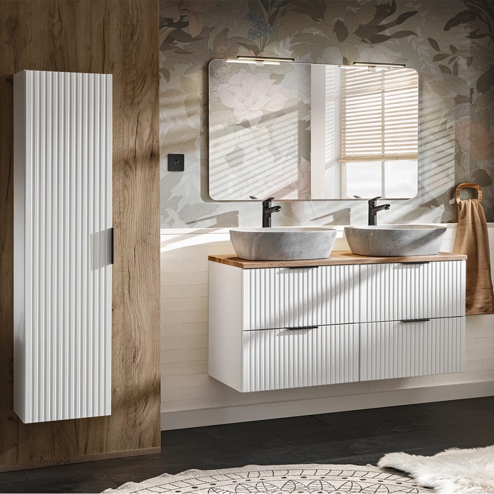 Set aus Doppelwaschtisch 120cm und Adriel-Säule Weiß und SteineffektKollektion :: Adriel Materialien : Melamin- und MDF-Platten 16 mm70% FSC-zertifiziertes Holz aus nachhaltiger ForstwirtschaftKeramikwaschbeckenPVC-Griffe Farbe : Möbel in WeißWaschtisch aus Holz in EichenoptikWaschbecken in Steinoptik3 Grifffarben: Mattschwarz, Gold und Silber inklusive Eigenschaften : Waschtisch : Hängeschrank4 SchubladenGeräuscharmes Schließsystem2 Aufsatzwaschbecken inbegriffenInklusive WaschtischWandbefestigung : Schrauben und Dübel inbegriffenEs wird empfohlen, die Befestigung an den Untergrund anzupassenErhältlich in 3 Größen : 60 cm, 80 cm und 120 cmErhältlich in 3 Farben : Schwarz matt, Weiß und Holz in Eichenholzoptik. Colonne : Hängeschrank1 umkehrbare Schiebetür (links oder rechts zu öffnen)3 RegaleGeräuscharmes SchließsystemWandbefestigungen: Schrauben und Dübel nicht inklusiveEs wird empfohlen, die Befestigungen an den Untergrund anzupassen. Weitere Informationen : Spiegel Nicht im Lieferumfang enthaltenArmaturen Nicht im Lieferumfang enthaltenFreier Auslauf Nicht im Lieferumfang enthaltenPlatzsparender Siphon Nicht im Lieferumfang enthaltenWaschtischplatte nicht gebohrt Gewicht : Waschtischunterschrank: 53 kgWaschbecken: 9 kgSäule: 21 kg Abmessungen : Waschtischunterschrank: 120,8 x 46 x 59 cmWaschbecken: 50 x 39 x 13 cmSäule: 35 x 25 x 140 cm Die angegebenen Maße können um einige Millimeter abweichen. Montagehinweise : Dieses Möbelstück ist für eine Wasserzufuhr aus der Wand konzipiert. Für eine optimale Montage wird die Verwendung eines Platzspar-Siphons dringend empfohlen, je nach Modell ist dieser sogar obligatorisch, um das ordnungsgemäße Schließen der Schubladen zu gewährleisten und Kollisionen mit der Rohrleitung zu vermeiden. Verpackung : Produkt wird geliefert, muss zusammengebaut werden, inkl. Anleitung. Produkt mit 24-monatiger Garantie. Gesamtanzahl der Kartons : 6 Gewicht und Abmessungen der Kartons: 22 kg82 x 48 x 13 cm / 22 kg82 x 48 x 13 cm / 9 kg133 x 51 x 4 cm / 21 kg153 x 38 x 8 cm / 9 kg57 x 45 x 21 cm / 9 kg57 x 45 x 21 cm