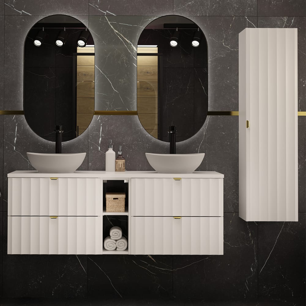 Doppelwaschtisch 140cm 2 Nischen und Säule Lexa WeißKollektion :: Lexa Europäische Herstellung Materialien : Front aus 18 mm MDF-PlattenKorpus aus 16 mm LaminatplattenWaschtisch aus 22 mm MDF-Platten und PVC-FinishsFSC-zertifiziertes Holz aus nachhaltiger ForstwirtschaftKeramikwaschbeckenMetallgriffe Farbe : Weiß und goldene Griffe Eigenschaften : Waschtisch : Hängeschrank4 Schubladen2 NischenGeräuscharmes SchließsystemAufsatzwaschbecken inbegriffenAbflussdurchmesser : 45 mmWaschtisch inbegriffenWandbefestigungen : Schrauben und Dübel inbegriffenEs wird jedoch empfohlen, Ihre Befestigungen an Ihren Untergrund anzupassen. Eigenschaften : Säule : Hängemöbel1 umkehrbare Schiebetür (links oder rechts zu öffnen)4 Regalböden Geräuscharmes SchließsystemWandbefestigungen : Schrauben und Dübel inklusiveEs wird jedoch empfohlen, Ihre Befestigungen an Ihren Untergrund anzupassen. Weitere Informationen : Spiegel nicht inbegriffenArmaturen nicht inbegriffenFreier Auslauf nicht inbegriffenSiphon nicht inbegriffenWaschtisch nicht gebohrt Gewicht : Waschtischunterschrank: 51 kgWaschbecken: 6 kgSäule: 23 kg Abmessungen : Waschtischunterschrank: 140,6 x 46,5 x 52,2 cmWaschbecken: 40,5 x 33,7 x 13,5 cmSäule: 34,5 x 31,8 x 130 cm Die angegebenen Maße können um einige Millimeter abweichen Sicherheitshinweise: Befestigen Sie das Möbelstück sicher an der WandBeachten Sie die empfohlenen Höchstlasten, die in den Anleitungen angegeben sind. Verpackung : Produkt wird zur Montage geliefert, inkl. Anleitung Produkt mit 24-Monats-Garantie Gesamtanzahl der Kartons : 7 Gewicht und Abmessungen der Kartons: 17 kg67 x 48 x 14 cm / 17 kg67 x 48 x 14 cm / 7,5 kg141 x 51 x 3 cm / 9 kg61 x 51 x 9 cm / 6 kg56 x 43 x 24 cm / 6 kg56 x 43 x 24 cm / 23 kg137 x 36 x 9 cm Gesetzlicher Vertreter: NAPKINS, 30-34 avenue Henri Matisse, 06200 Nizza, Frankreich
