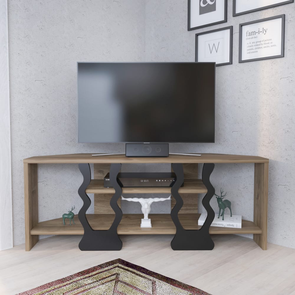 Mit dem modernen Eck-TV-Ständer gestalten Sie Ihren perfekten Heimkino-Bereich und eine gemütliche Filmecke in Ihrem Zuhause. Dank seines cleveren Eckdesigns passt er problemlos in jede Raumecke, ist besonders gut für kleine Wohnungen geeignet und hilft dabei, Platz zu sparen. Ordner, DVD-Player, Spielkonsolen, DVDs, Bücher und CDs finden in dem praktischen Regalelement ihren Platz und sind stets griffbereit. Die Montage ist dank der beiliegenden, bebilderten Anleitung einfach auch für Anfänger kein Problem.