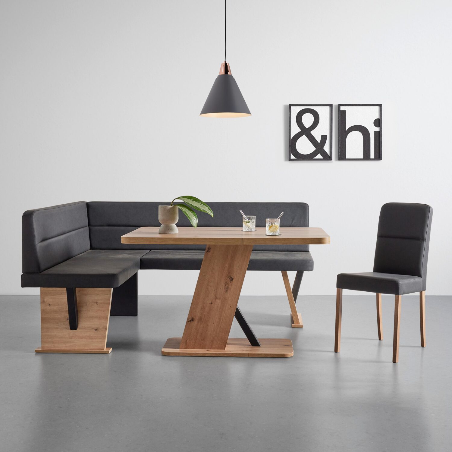Nutzen Sie die vorhandene Raumfläche optimal aus und platzieren diese moderne Eckbank mit wangenförmigen Füßen in Ihrer Küche oder im Esszimmer. Die praktische wie schöne Sitzgelegenheit aus Holz Dekor in Eiche Artisan und mit einem Lederlook in Schwarz misst etwa 141 x 85 x 181 cm (B x H x T). Dank des Polyurethanschaumkerns als Innenleben sitzen Sie hier zu dritt bequem und komfortabel. Dabei beträgt die Sitzhöhe ca. 49 cm und die maximale Belastbarkeit rund 360 Kilogramm. Tipp: Passende Esstische und Stühle zu dieser Eckbank finden Sie in unserem Online Shop.