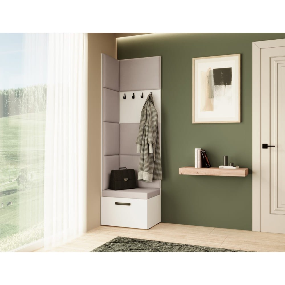 Der Garderobenschrank MARGARET V vereint modernes Design mit hoher Funktionalität und schafft eine elegante sowie organisierte Atmosphäre in Ihrem Eingangsbereich. Der Korpus aus 16 mm starker laminierter Platte sorgt für Robustheit und Langlebigkeit, während die dekorativen gepolsterten Paneele eine edle Optik bieten und gleichzeitig den Wohnkomfort erhöhen.