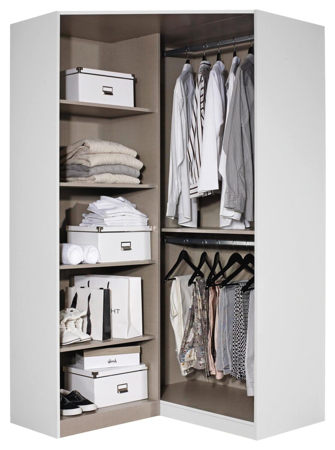 Dieser Eckschrank in Weiß nützt auf optimale Weise den vorhandenen Platz in Ihrem Schlafzimmer aus und bietet Ihnen alleine stehend oder in Kombination mit anderen Schrankelementen viel Platz zum Aufbewahren Ihrer Garderobe. Der ca. 117 x 197 x 104 cm (B x H x T) große Eckschrank aus Holzdekor ist mit 5 Einlegeböden hinter den 2 Drehtüren ausgestattet. Weiters kann er mit 2 Kleiderstangen aufwarten. HINWEIS Dieser Artikel wird in unseren Filialen nicht ausgestellt, ist dort jedoch einfach und bequem bestellbar und wird direkt zu Ihnen nach Hause geliefert. Bitte beachten Sie, dass die abgebildete Dekoration im Lieferumfang nicht enthalten ist.