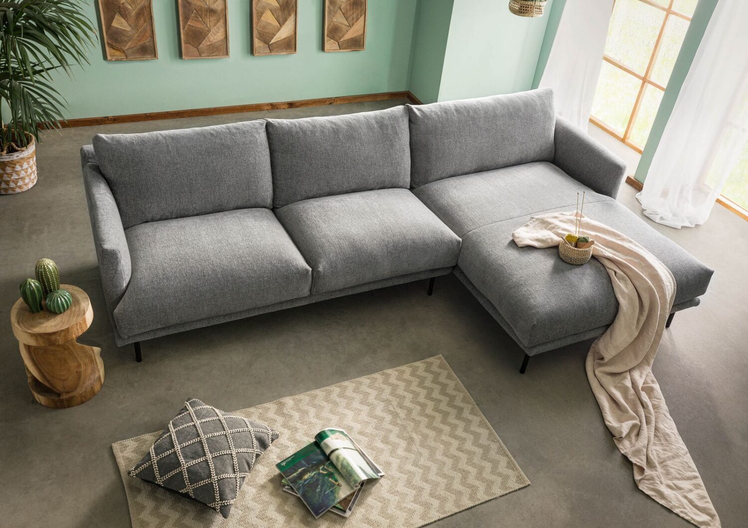 graues Ecksofa im modernen Design Schnitt: schlanke Metallbeine, hoher Sitzaufbau (Bodenfreiheit 19 cm) und große Liegefläche bequemer Sitzkomfort dank formstabiler Kaltschaumpolster auf Wellenfederung Neben Stoffsofas führen wir auch weitere Polstermöbel – ein Blick in die Kategorie Sofas lohnt sich!