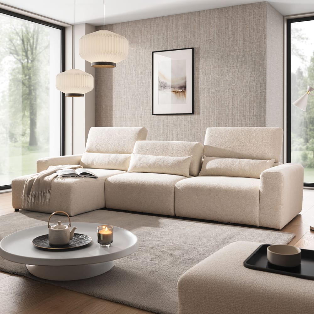Ecksofa links 3-sitzig Kopfstützen aufstellbar Velano BeigeKollektion :: Velano Herstellung: Europäische Herstellung Materialien : Bezug: Stoff 100% PolyesterSitzpolsterung: Polyurethanschaum T30 und Wellenfedern Typ BRückenpolsterung: Polyurethanschaum T25Kissen: SchaumstofffüllungGestell: KiefernholzGestell ABS schwarz Farbe : Beige Eigenschaften: 3-Sitzer Meridian-SofaBewegliche Kopfstützen für maximalen Komfort3 LendenstützkissenEinfache Montage mit Verbindungsstücken3 ZierkissenAbnehmbare Zierkissen Gewicht : 180 kg Abmessungen : Sofa: 314 x 167 x 80/97 cmSitzhöhe: 40 cmArmlehnenhöhe: 57 cm Verpackung : Produkt wird zur Montage geliefert, inkl. Anleitung Produkt mit 24-Monats-Garantie Gesamtanzahl der Kartons : 3 Gewicht und Größe der Kartons: 60 kg112 x 167 x 97 cm / 60 kg90 x 103 x 97 cm / 60 kg112 x 103 x 97 cm Gesetzlicher Vertreter: NAPKINS, 30-34 avenue Henri Matisse, 06200 Nizza, FRANKREICH