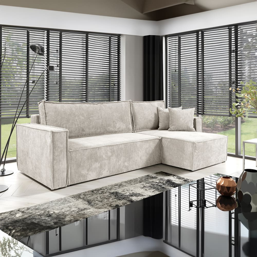 Ezekiel Ecksofa, umkehrbar, umwandelbar, 3-Sitzer, Cord, Blanc CasséKollektion :: Ezekiel Herstellung: Europäische Herstellung Material: Cordstoff 100% PolyesterSitzpolsterung: 11 cm dicker T28-Polyurethanschaum und WellenfedernRückenpolsterung: 8 cm dicker T25-SchaumABS-Fußkreuz schwarz Farbe : Gebrochenes Weiß Eigenschaften: 3-Sitzer-Sofa mit MeridianUmkehrbare Ecke: Der Meridian kann bei der Montage rechts oder links platziert werdenKann in ein Gästebett umgewandelt werdenLeichtes Öffnen: Vorschub des Sitzes unterstützt durch das automatische Entfaltungssystem DL und Kippen der RückenlehneMechanismus mit VerlangsamungAufbewahrungsbox: Maximalgewicht 8kg2 Rückenkissen2 ZierkissenAbnehmbare Rücken- und ZierkissenIn 9 Farben erhältlich. Gewicht : 100 kg Abmessungen : Sofa: 236 x 148 x 88 cmLiegefläche: 200 x 135 cmSitzhöhe: 37 cmMeridianbreite: 73 cm Verpackung : Produkt wird zur Montage geliefert, inkl. Anleitung Produkt mit 24-Monats-Garantie Gesamtanzahl der Kartons : 3 Gewicht und Größe der Kartons: 45 kg132 x 90 x 55 cm / 40 kg75 x 150 x 75 cm / 15 kg110 x 60 x 52 cm Gesetzlicher Vertreter: NAPKINS, 30-34 avenue Henri Matisse, 06200 Nizza, FRANKREICH
