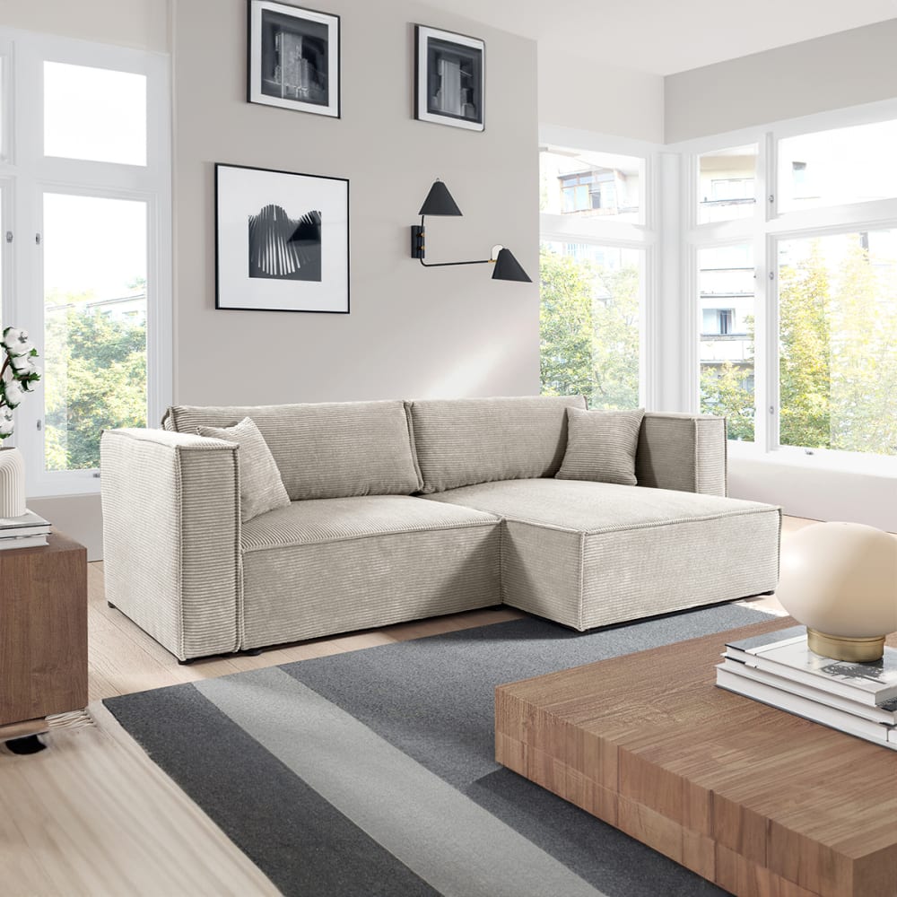 Ecksofa, umkehrbar, umwandelbar, 3-sitzig, Jimmy, Cord, Blanc CasséKollektion :: Jimmy Herstellung: Europäische Herstellung Material: Cordstoff 100% PolyesterSitzpolsterung: 11 cm dicker T28-Polyurethanschaum und WellenfedernRückenpolsterung: 8 cm dicker T25-SchaumABS-Fußkreuz schwarz Farbe : Gebrochenes Weiß Eigenschaften: 3-Sitzer-Sofa mit MeridianUmkehrbare Ecke: Der Meridian kann bei der Montage rechts oder links platziert werdenKann in ein Gästebett umgewandelt werdenLeichtes Öffnen: Vorschub des Sitzes unterstützt durch das automatische Entfaltungssystem DL und Kippen der RückenlehneMechanismus mit VerlangsamungAufbewahrungsbox: Maximalgewicht 8kg2 Rückenkissen2 ZierkissenAbnehmbare Rücken- und ZierkissenIn 9 Farben erhältlich. Gewicht : 100 kg Abmessungen : 245 x 104148 x 77 cmLiegefläche: 200 x 136 cmSitzhöhe: 40 cmArmlehnenhöhe: 70 cmMeridianbreite: 102 cm Verpackung : Produkt wird zur Montage geliefert, inkl. Anleitung Produkt mit 24-Monats-Garantie Gesamtanzahl der Kartons : 3 Gewicht und Größe der Kartons: 40 kg106 x 95 x 54 cm / 35 kg156 x 108 x 70 cm / 25 kg110 x 60 x 70 cm Gesetzlicher Vertreter: NAPKINS, 30-34 avenue Henri Matisse, 06200 Nizza, FRANKREICH