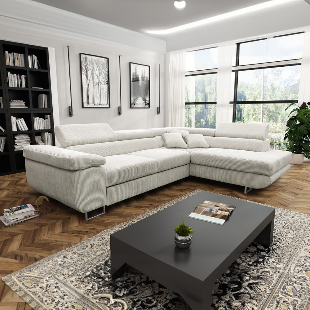 Ecksofa, umwandelbar, gerade, 4-sitzig, Truhe Martin Cord Blanc CasséKollektion :: Martin Herstellung: Europäische Herstellung Materialien : Bezug: Cordstoff 100% PolyesterSitzpolsterung: Schaumstoff T 28, 11 cm dick, und WellenfedernRückenpolsterung: Schaumstoff T 25, 8 cm dickGestell aus verchromtem Metall und schwarzem ABS Farbe : Gebrochenes Weiß Eigenschaften: 4-Sitzer MeridiansofaMeridian auf der rechten SeiteHöhenverstellbare KopfstützeKann in ein Gästebett umgewandelt werdenAusklappsystem mit Schublade auf RollenAufbewahrungsbox unter dem Meridian -Meridian: Windenmechanismus mit Stoßdämpfer3 Zierkissen (45 x 45 cm)Erhältlich in 7 Farben Gewicht : 160 kg Abmessungen : Sofa: 274 x 100203 x 7588 cmLiegefläche: 198 x 125 cmSitzhöhe: 44 cmArmlehnenhöhe: 60 cmMeridianbreite: 103 cm Verpackung : Produkt wird zur Montage geliefert, inkl. Anleitung Produkt mit 24-Monats-Garantie Gesamtanzahl der Kartons : 2 Gewicht und Abmessungen der Kartons: 78 kg203 x 106 x 60 cm / 81 kg100 x 178 x 60 cm Gesetzlicher Vertreter: NAPKINS, 30-34 avenue Henri Matisse, 06200 Nizza, FRANKREICH