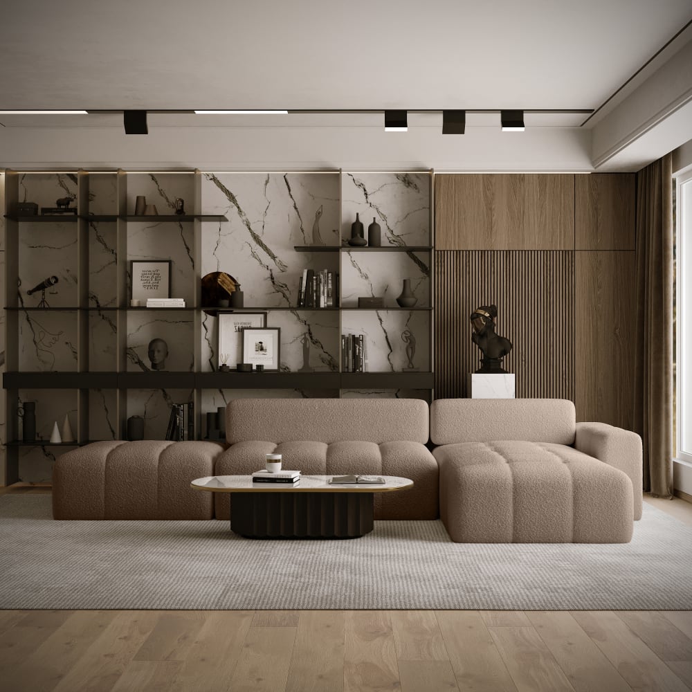 Das Ecksofa RIFU LA verbindet modernes Design mit praktischem Komfort. Stabiler Holzrahmen, bequeme Wellenfederung und die hochwertige Polsterung machen es zur idealen Wahl für Ihr Wohnzimmer. Der weiche Bouclé-Stoff Anthology verleiht dem Sofa eine elegante, natürliche Optik. Dank Schlaffunktion und Bettkasten ist es nicht nur schön, sondern auch funktional.