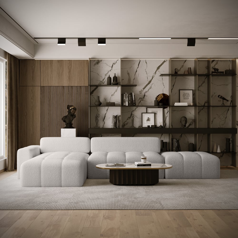 Das Ecksofa RIFU LA verbindet modernes Design mit praktischem Komfort. Stabiler Holzrahmen, bequeme Wellenfederung und die hochwertige Polsterung machen es zur idealen Wahl für Ihr Wohnzimmer. Der weiche Bouclé-Stoff Anthology verleiht dem Sofa eine elegante, natürliche Optik. Dank Schlaffunktion und Bettkasten ist es nicht nur schön, sondern auch funktional.