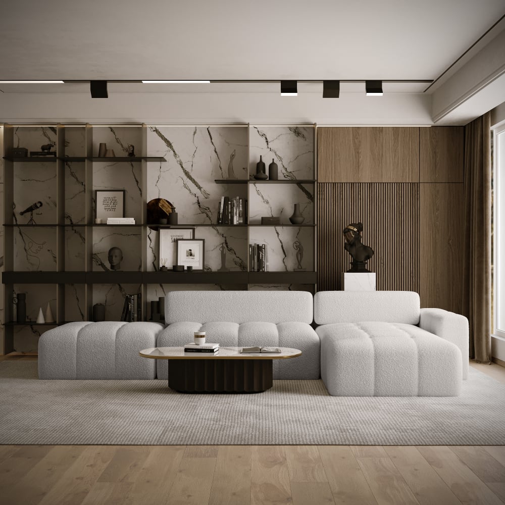 Das Ecksofa RIFU LA verbindet modernes Design mit praktischem Komfort. Stabiler Holzrahmen, bequeme Wellenfederung und die hochwertige Polsterung machen es zur idealen Wahl für Ihr Wohnzimmer. Der weiche Bouclé-Stoff Anthology verleiht dem Sofa eine elegante, natürliche Optik. Dank Schlaffunktion und Bettkasten ist es nicht nur schön, sondern auch funktional.