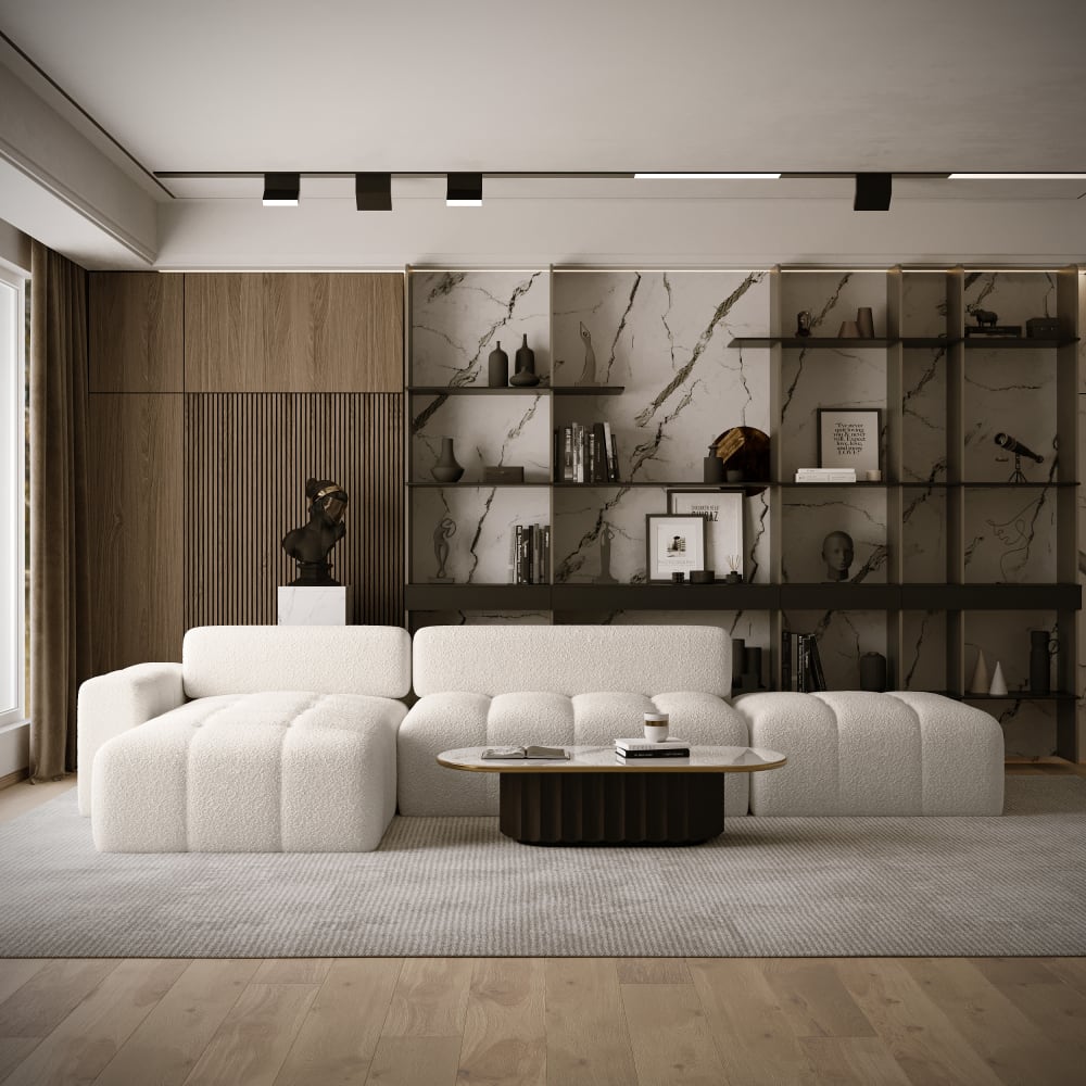 Das Ecksofa RIFU LA verbindet modernes Design mit praktischem Komfort. Stabiler Holzrahmen, bequeme Wellenfederung und die hochwertige Polsterung machen es zur idealen Wahl für Ihr Wohnzimmer. Der weiche Bouclé-Stoff Anthology verleiht dem Sofa eine elegante, natürliche Optik. Dank Schlaffunktion und Bettkasten ist es nicht nur schön, sondern auch funktional.