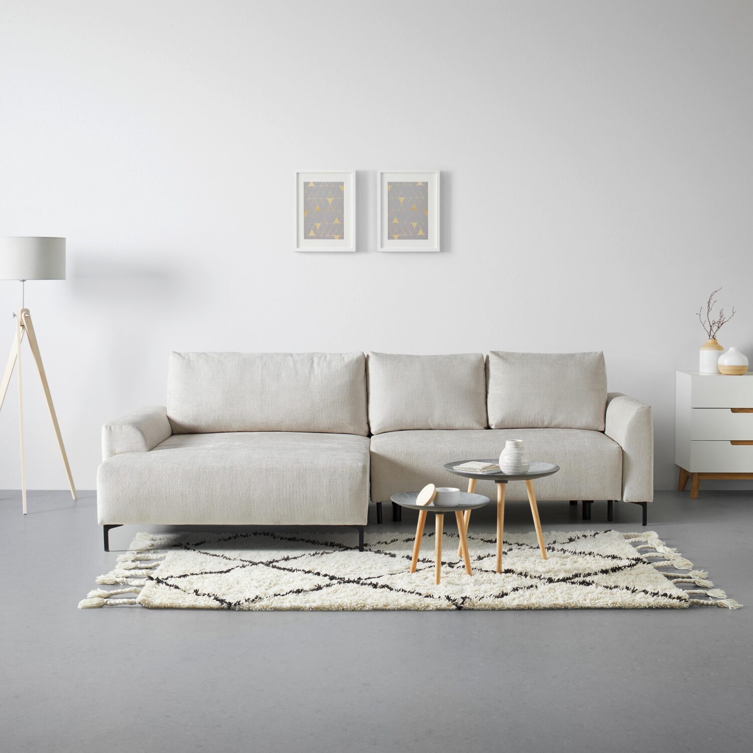 Machen Sie Ihr Wohnzimmer zum stilvollen Wohlfühlort – mit dem Ecksofa Integra. Mit seinen großzügigen Maßen von 170 x 81–93 x 294 cm (B x H x T) bietet es genug Platz für entspannte Abende, Serienmarathons oder gemütliche Lesestunden. Die edle Chenille-Oberfläche in Beige verleiht dem Sofa eine moderne, wohnliche Ausstrahlung und fühlt sich herrlich weich an. Innen sorgen eine Nosagunterfederung und Schaumstoffpolsterung für höchsten Sitzkomfort – perfekt für 3 Personen, die entspannt sitzen und chillen möchten. Die Sitzhöhe von ca. 61–88 cm sowie eine Sitztiefe von ca. 61 cm sorgen für ein angenehmes, ergonomisches Sitzgefühl. Dank der cleveren Schlaffunktion mit einer Liegefläche von ca. 135 x 250 cm wird aus dem Sofa im Handumdrehen ein komfortables Bett – natürlich mit Schlafen auf Sitzhöhe. Der praktische Bettkasten bietet zudem Stauraum für Decken oder Kissen. Besonders smart: Die Ottomane ist rechts montierbar, sodass Sie das Sofa perfekt auf Ihre Raumverhältnisse abstimmen können – ideal als