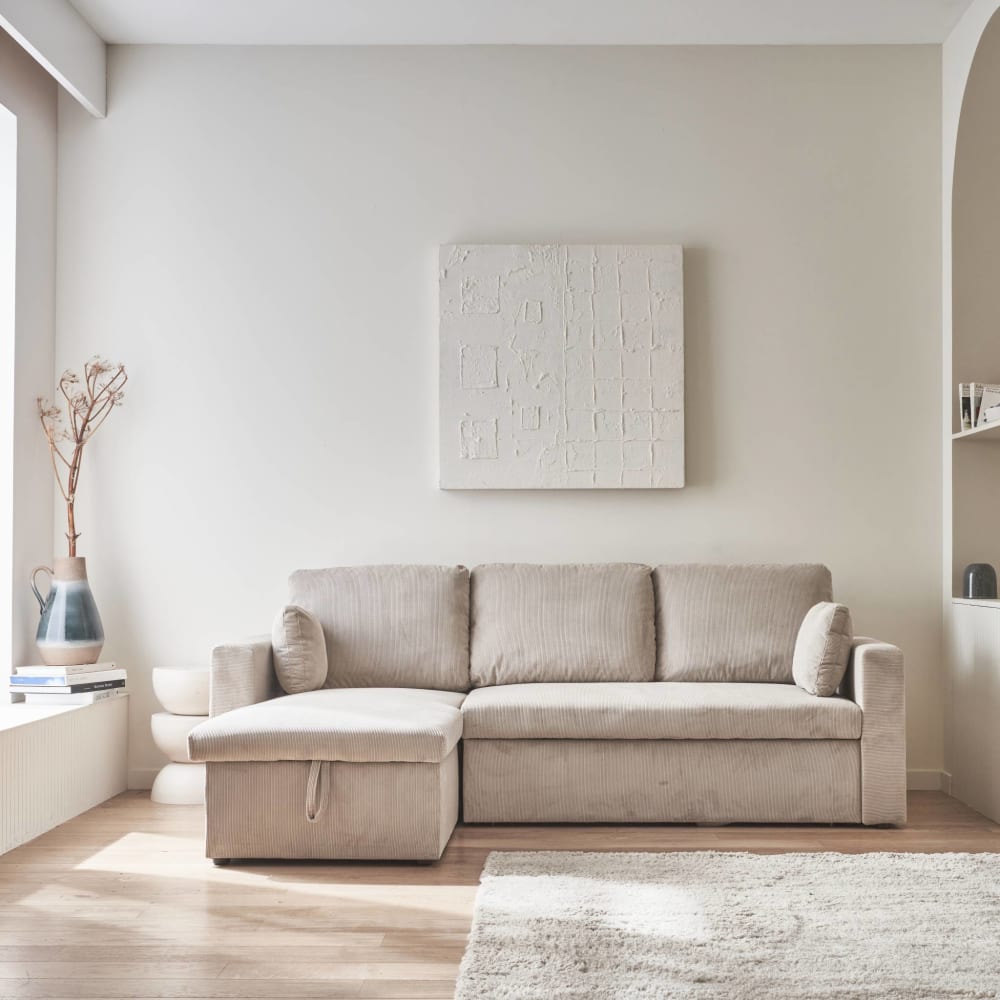 Ecksofa mit beigegrauem Cordbezug und Schlaffunktion von sweeek