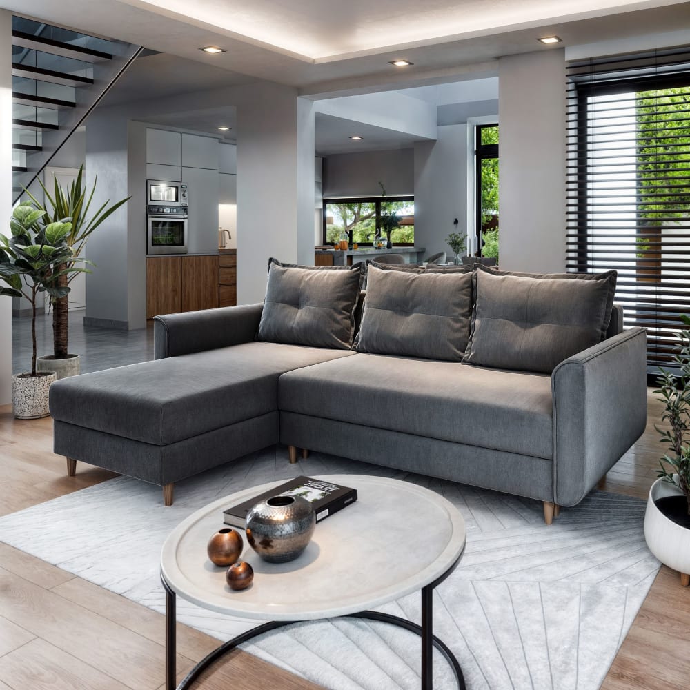 Ecksofa mit Schlaffunktion aus Plüsch-Stoff, Grau von Masseno