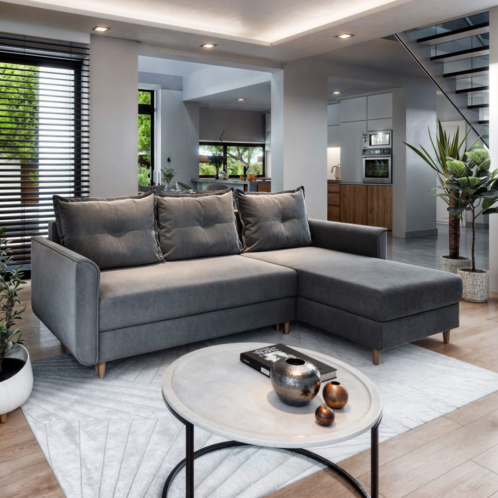 Ecksofa mit Schlaffunktion aus Plüsch-Stoff, Grau von Masseno