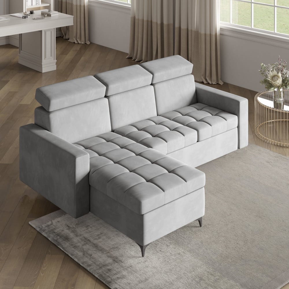 Ecksofa mit Schlaffunktion aus Plüsch-Stoff, Hellgrau von Masseno