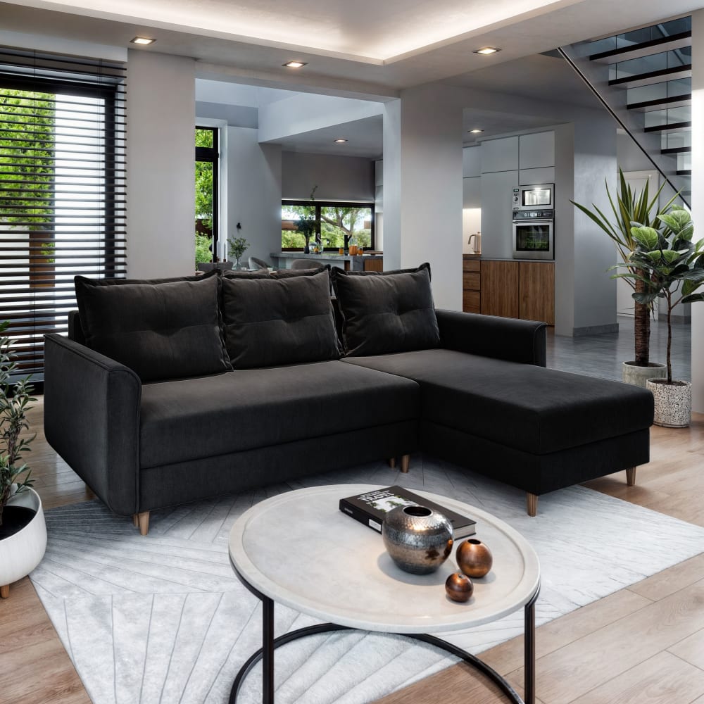 Ecksofa mit Schlaffunktion aus Plüsch-Stoff, Schwarz von Masseno