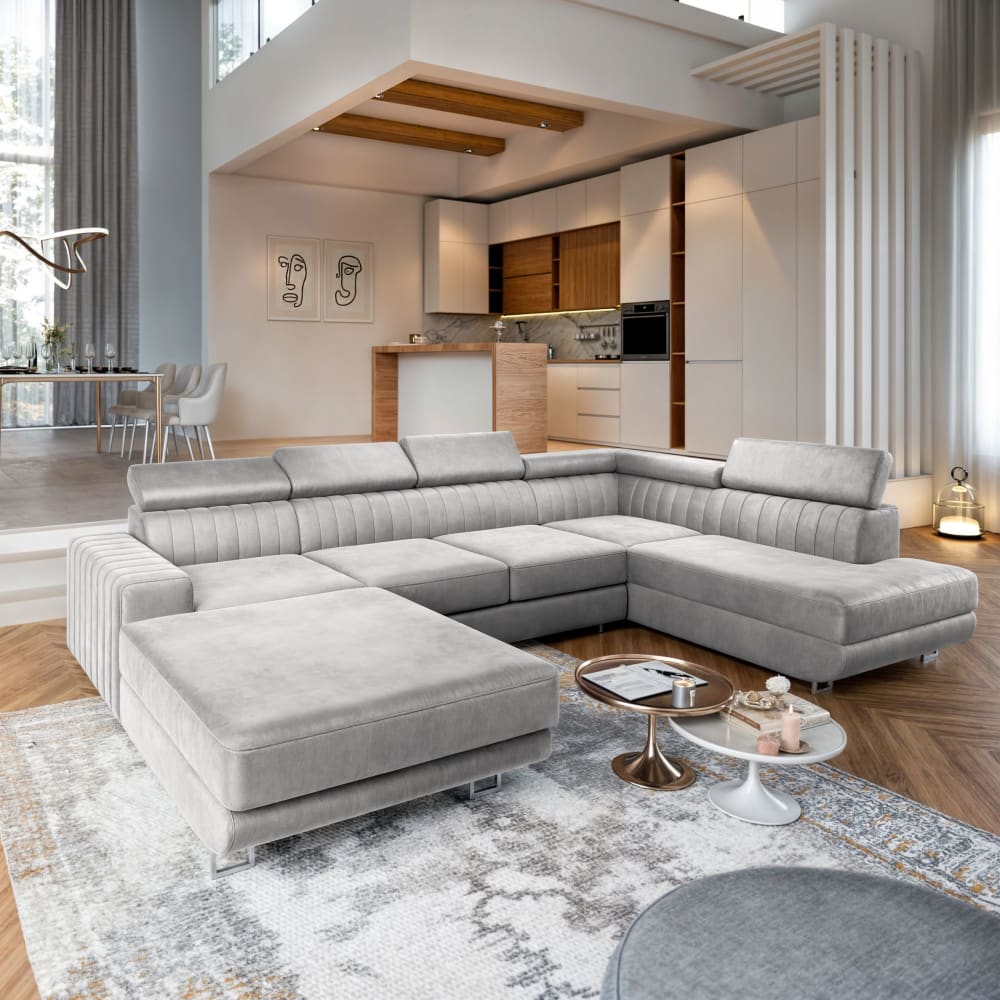 Ecksofa mit Schlaffunktion aus Velours-Stoff, Hellgrau von Masseno