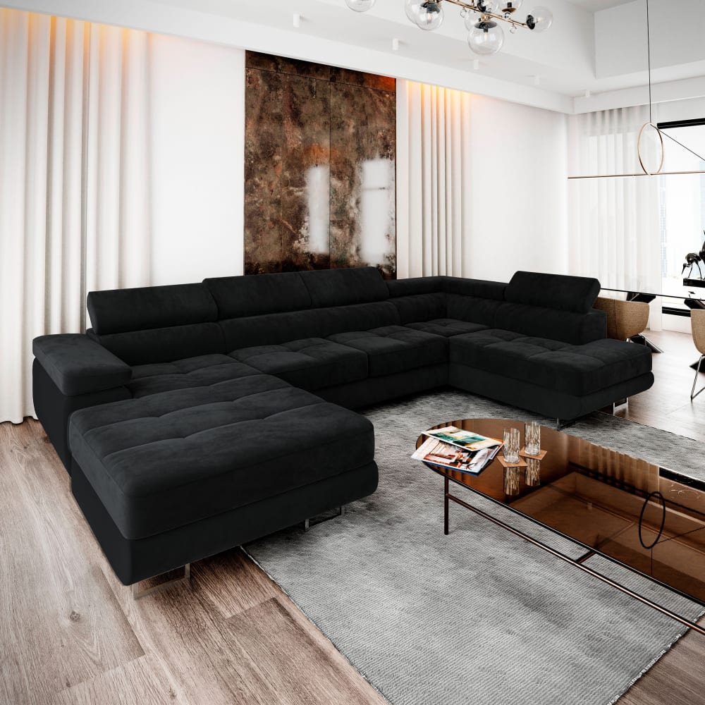 Ecksofa mit Schlaffunktion aus Velours-Stoff, Schwarz von Masseno