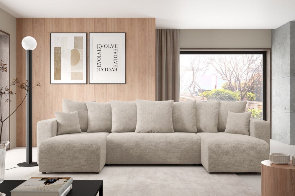 Entdecken Sie den Komfort und die Funktionalität des Ecksofas EVORA U, perfekt für jedes Wohnzimmer. Dieses Schlafsofa bietet eine praktische Schlaffunktion mit einer Liegefläche von 200 x 135 cm, ideal für zwei Personen.