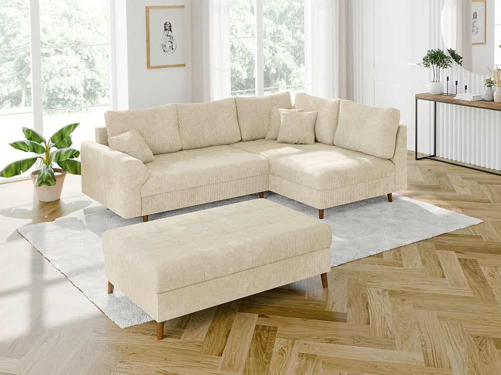 Ecksofa mit Schlaffunktion und Hocker aus Chenille-Stoff, Beige von S-Style Möbel