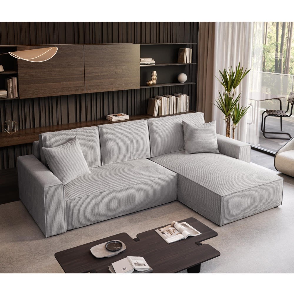 L-Form Ecksofa Parys in fügt sich perfekt in ein trendiges Wohnzimmer ein. Ecksofa 290 cm breit Parys ausgestattet mit einer Schlaffunktion, die eine Schlaffläche von 244 x 140 cm schafft, sowie Bettkasten. Rahmen aus Massivholz und Spanplatte.
