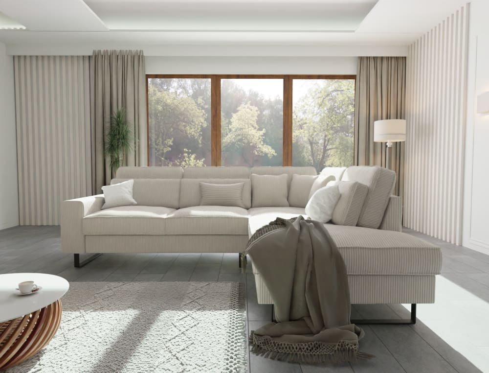 Tauchen Sie ein in Luxus und Komfort mit diesem exquisiten Ecksofa. Hergestellt aus hochwertigem Cordstoff strahlt es Raffinesse und Eleganz aus und bietet gleichzeitig eine unvergleichliche Langlebigkeit. Das subtile, aber fesselnde Farbschema ergänzt mühelos jede Inneneinrichtung und hebt die Ästhetik Ihres Wohnraums hervor.