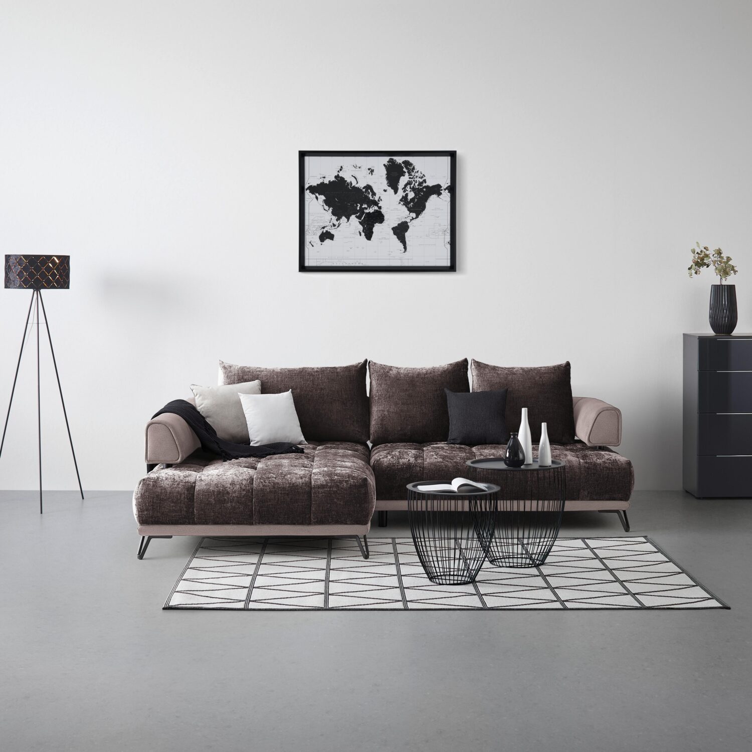 Das Ecksofa MORGAN in sanftem Taupe verbindet stilvolle Zurückhaltung mit purem Wohnkomfort. Die elegante L-Form, kombiniert mit dem hochwertigen Veloursbezug und der klaren Linienführung, macht MORGAN zum idealen Begleiter für moderne, wohnliche Interiors mit Charakter. Ein Sofa, das optisch dezent bleibt – aber im Komfort ganz groß rauskommt. Mit seinem großzügigen Schenkelmaß von ca. 184 x 262 cm lädt MORGAN zum gemütlichen Entspannen ein – ob allein oder mit Gästen. Die Sitzhöhe beträgt ca. 43 cm, die Sitztiefe ca. 61 cm, und auch die breiten Armlehnen versprechen entspanntes Zurücklehnen. Innen sorgen Schaumstofffüllung und Wellenunterfederung für ein komfortables Sitzgefühl. Und das Beste: Der Rücken ist echt bezogen, also auch freistehend ein echter Hingucker! Der Veloursbezug in Taupe verleiht dem Sofa eine warme, elegante Note, die sich wunderbar mit natürlichen Materialien, gedeckten Farben oder Metallic-Akzenten kombinieren lässt. Die schwarzen Metallfüße (ca. 12 cm hoch) setzen einen modernen Kontrast. Mit einer
