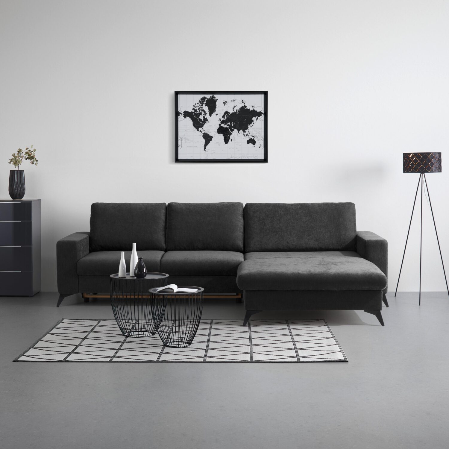 Das Ecksofa SUNNY in elegantem Schwarz lädt zum Entspannen und Verweilen ein. Mit einem pflegeleichtem Bezug aus Synthetikfaser bietet dieses Sofa nicht nur eine stilvolle Optik, sondern auch eine angenehme Haptik. Die Wellenunterfederung sorgt für optimalen Sitzkomfort. Das Sofa verfügt über eine L-Form und ist seitenverkehrt montierbar. Die maximale Belastbarkeit pro Sitz beträgt ca. 120 kg. Das Ecksofa SUNNY bietet mit 4 Sitzplätzen ausreichend Platz für Familie und Freunde. Eine Schlaffunktion mit Bettkasten ist auch inkludiert. Die ca. Maße des Sofas betragen 290 x 87 x 178 cm (B x H x T). Die Sitzhöhe liegt bei ca. 44 cm.