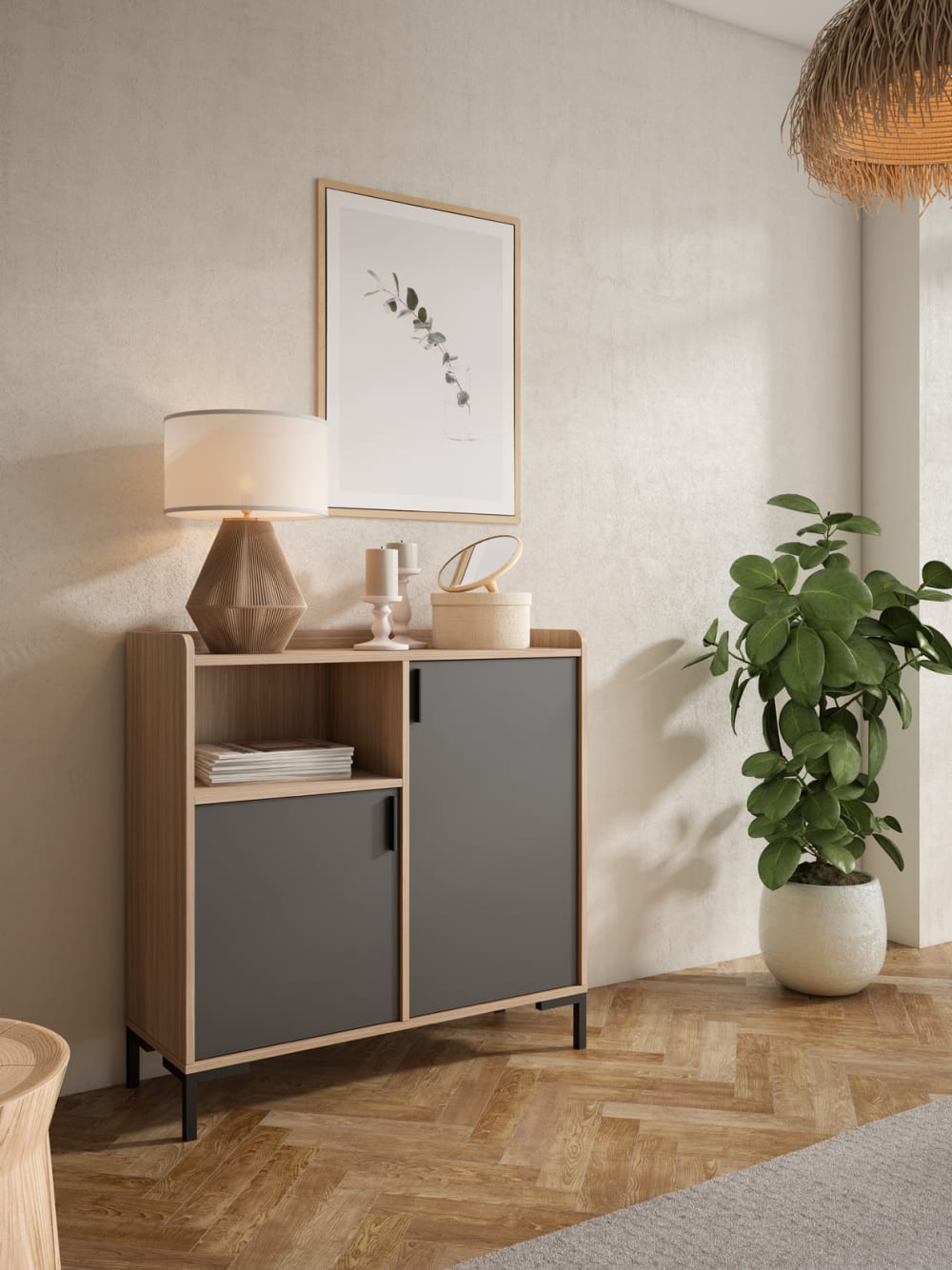Verleihen Sie Ihrem Zuhause Stil und Funktionalität mit diesem eleganten Sideboard aus Melamin, perfekt, um alles ordentlich aufzubewahren. Sein geschwungenes, modernes Design mit schwarzen Metallfüßen und -griffen macht es zu einer robusten und raffinierten Wahl. Ideal als Schuhschrank oder zur Aufbewahrung anderer Gegenstände, macht ihn seine Vielseitigkeit unverzichtbar in Fluren, Wohnzimmern oder Schlafzimmern. Optimieren Sie Ihren Raum mit diesem praktischen und dekorativen Möbelstück, das Qualität, Design und Funktionalität in einem Produkt vereint. Machen Sie Ihr Zuhause ordentlicher und stilvoller!Eigenschaften : Materialien : Struktur und Türen aus Melamin, Füße und Griffe aus pulverbeschichtetem Metall zum Schutz vor Oxidation.Zurückgesetzte Türen für ein geometrischeres Aussehen.2 asymmetrische Türen.1 herausnehmbarer Einlegeboden in der unteren Türöffnung und 2 ebenfalls herausnehmbare Einlegeböden in der oberen Türöffnung.Einlegeböden in fester horizontaler Position.Soft-Close-Scharniere zur Vermeidung von Zuschlagen.Zertifikate : FSC, PEFC.Herstellung : Spanien.Rückwand zur Vermeidung von Flecken an der Wand.Möbel wird als Bausatz mit Montageanleitung verkauft.Versand in 1 Paket.Reinigungshinweis :Reinigung mit einem trockenen oder leicht feuchten Tuch unter Verwendung von ausschließlich für Holz und Möbel geeigneten Produkten (das Möbelstück zu befeuchten oder ein in Wasser getränktes Tuch zu verwenden, kann es beschädigen und ist nicht durch die Garantie abgedeckt).Allgemeine Abmessungen :Höhe: 88cm.Breite: 90cm.Tiefe: 33cm.Gewicht: 29.5kg.Spezifische Abmessungen :Offenes Fach: H21,7 x B42,5 x T32 cm.Beinhöhe: 12cm.Nutzbare Fläche auf dem Möbel: Länge 86,5cm und Tiefe 31cm.Oberer Rand Höhe: 4cm.