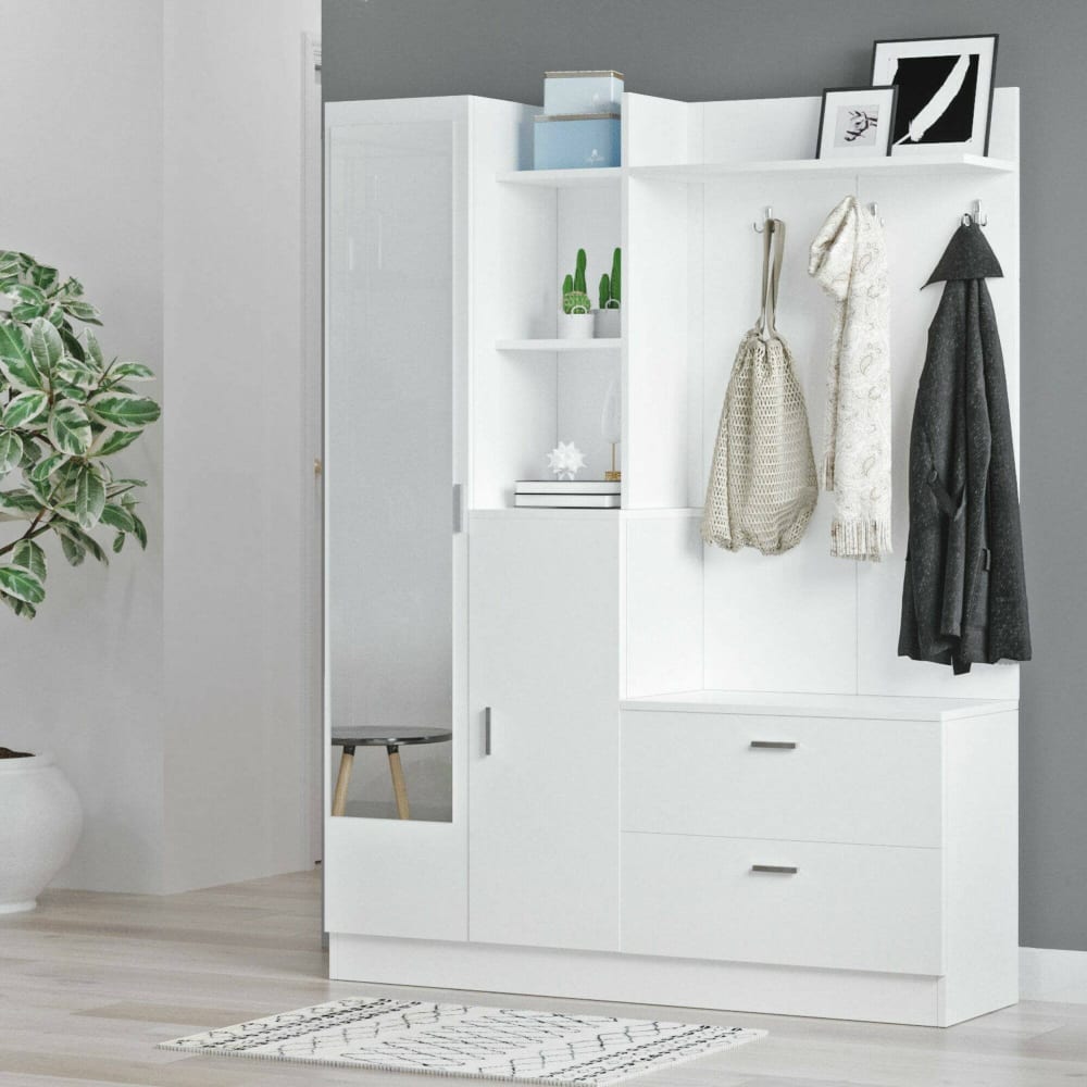 EINGANGSMÖBEL – Moderner Eingang, Wandgarderobe, Multifunktions-Aufbewahrungskonsole, 140x37h182 cm, Weiß. AUFBAU UND VERWENDUNG – Modernes und platzsparendes Eingangsmöbel, die ideale Lösung für die elegante und intelligente Einrichtung Ihres Eingangs – Die Elemente, aus denen es besteht, machen es perfekt für die Eingangshalle, dank des Sets, das alles enthält, was Sie für Ihren Eingangsbereich benötigen – Mehrzweckartikel, ideal für die ordentliche und immer griffbereite Aufbewahrung kleiner Gegenstände – Multifunktionseingang mit Designer-Oberflächen, perfekt für die Aufbewahrung von Jacken, Hüten und Accessoires. QUALITÄT UND DESIGN – Modernes und elegantes Design-Möbelstück, perfekt für die Einrichtung einer zeitgemäßen und hellen Umgebung – Ideal für alle, die nach Funktionalität und platzsparenden Lösungen suchen, ist dieses Produkt perfekt für Häuser und Wohnungen aller Größen – Zwei Jahre Garantie ab Kaufdatum – Montiert. TECHNISCHE EIGENSCHAFTEN – Vielseitiges Einrichtungszubehör, konzipiert für die einfache Integration mit anderen Möbeln – Widerstandsfähige Verpackung, konzipiert für den E-Commerce – Material: Melaminbeschichtete Platte 18mm – Zusätzliche Infos: Standardmäßiges Öffnen und Schließen – Nicht als Raumtrenner geeignet. ABMESSUNGEN IN CM – Eingangsmöbel : Länge: 140 Breite: 36,8 Höhe: 181,8