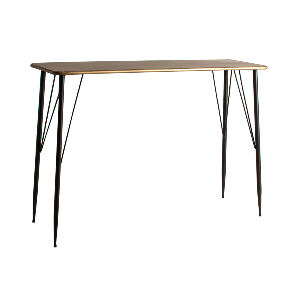 Eleganter Schreibtisch, der sich durch seine geraden und einfachen Linien auszeichnet. Er ist aus Metall mit schwarzen Beinen und einer goldfarbenen Platte gefertigt und lässt sich perfekt mit jeder Arbeitsumgebung kombinieren. Das Material ist widerstandsfähig und leicht zu reinigen. Abnehmbar.
