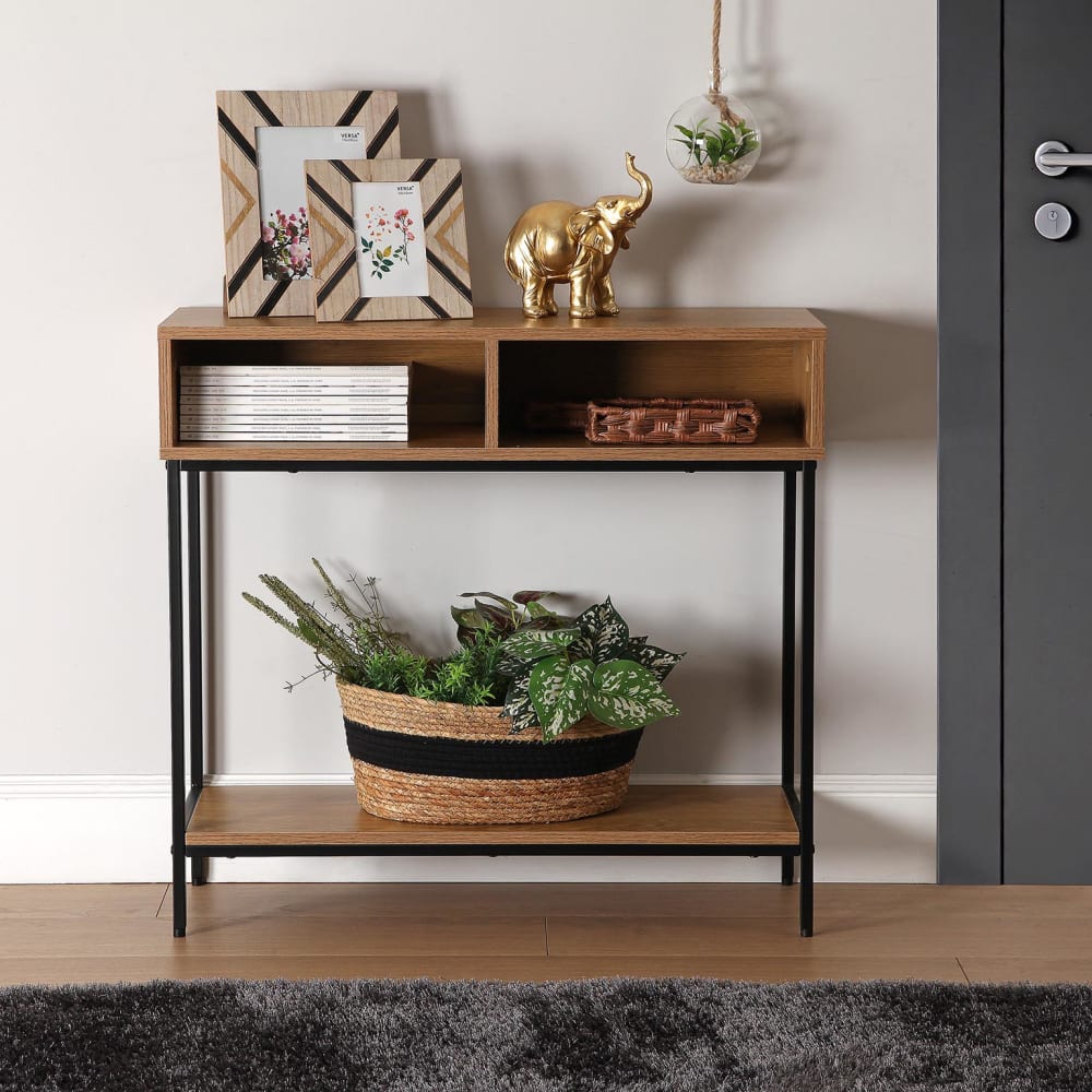 Empfangskonsole aus Spanplatte in Holzoptik und Metall, schwarz von Versa Home